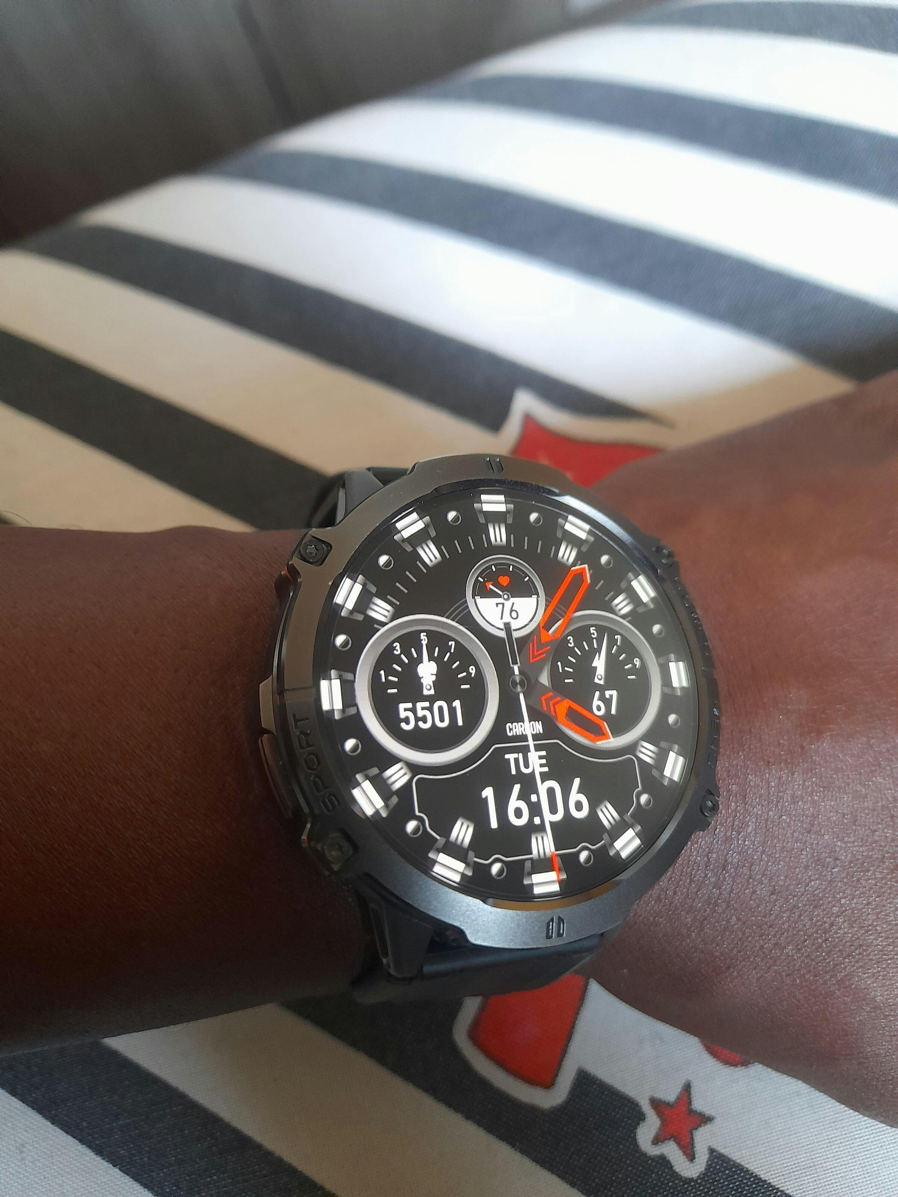 O Carbon One Max é um smartwatch completo: monitoramento de saúde (frequência cardíaca, pressão arterial, oxigenação, sono e mais), chamadas via Bluetooth, notificações de apps, controle de música, modos esportivos (com GPS do celular), cronômetro, alarme, calculadora, mostradores personalizáveis, duas pulseiras inclusas (metal e silicone) e resistência à água com tecnologia AquaShield. Tudo isso com bateria de longa duração.